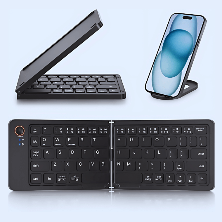 Bluetooth Foldable Keyboard: JPHTEK A portable folding keyboard with a free phone holder allows you to work anywhere, anytime! The standard-size design provides accurate, fast typing, just like the desktop keyboard you are used to. Quiet keys allow you to focus on your work. Perfect for travel and business trips.