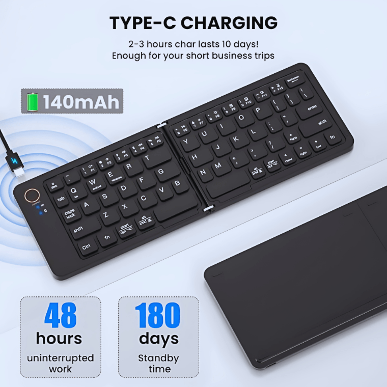 • Comfortable and Silent Typing Experience: The concave keycap design of a wireless Folding Keyboard provides comfortable and quiet typing, ensuring a pleasant typing experience.
